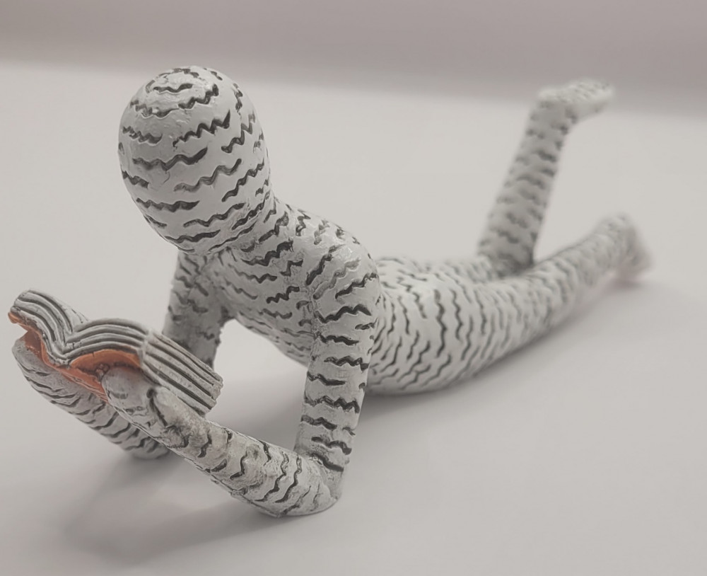 Bring ro og fordybelse ind i din indretning med denne unikke liggende Bogro-figur. Figuren forestiller en læser afslappet liggende med en åben bog – et smukt symbol på nærvær, afslapning og kærlighed til litteratur.