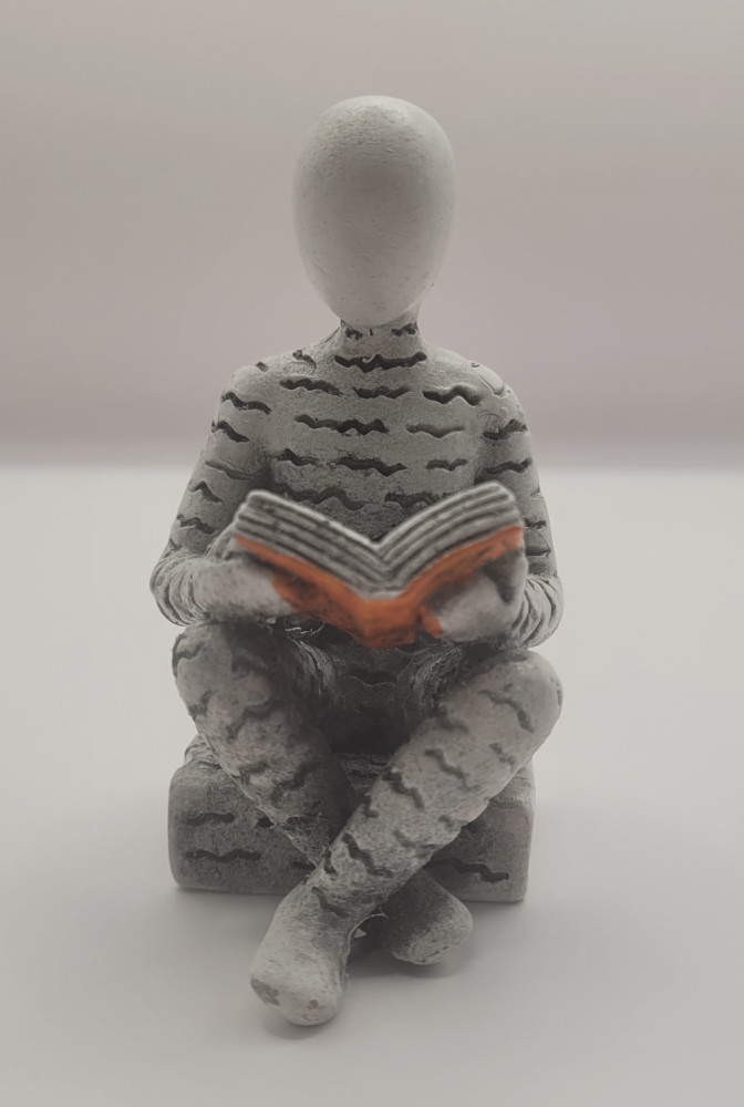 Tilfør varme og fordybelse til din indretning med denne smukke siddende Bogro-figur. Figuren forestiller en læser opslugt af sin bog, siddende afslappet med benene over kors – et stærkt symbol på ro, nærvær og kærlighed til litteratur.