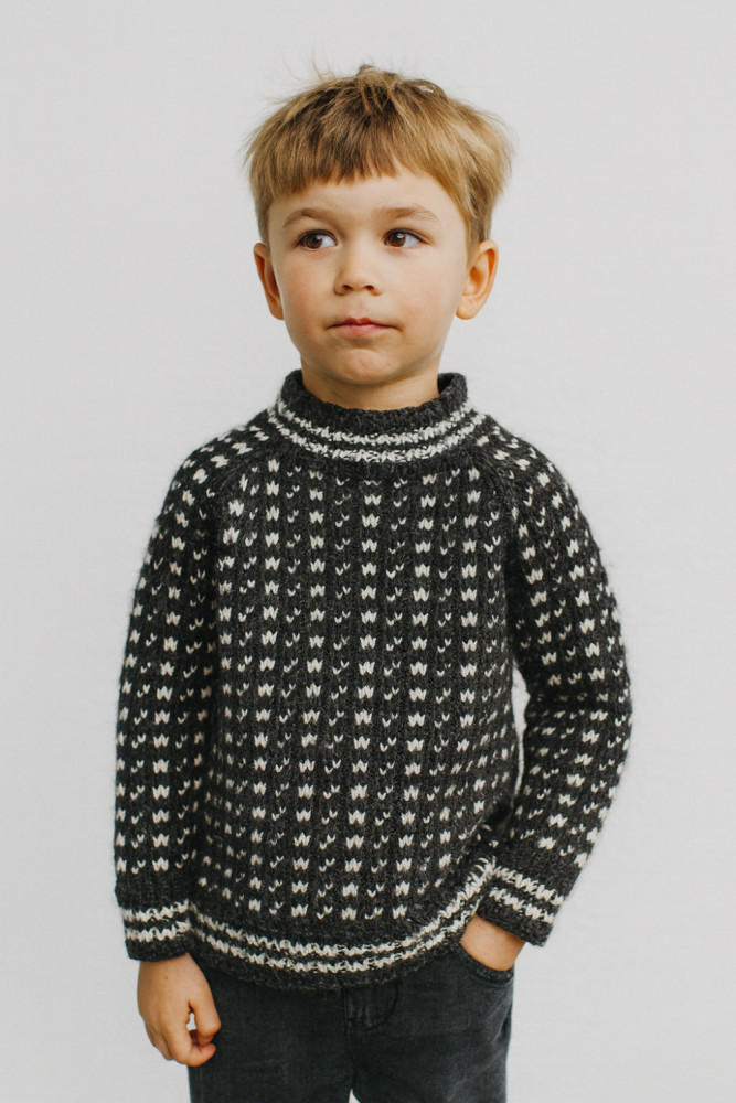 Hold dit barn varmt og stilfuldt i denne håndstrikkede børnesweater i 100% merinould. Sweateren har et klassisk, sort/hvidt mønster med fine detaljer og ribkanter ved hals, ærmer og bund, som sikrer en god pasform og komfort.