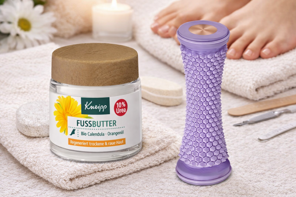 Fodmassage rullen stimulerer fødderne og øger velværet, mens den nærende fodcreme med 10 % urea og plejende planteingredienserhjælper med at regenerere tør og ru hud.
