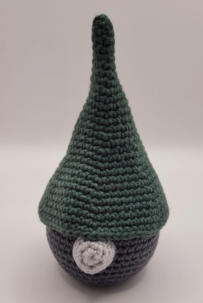 Denne charmerende hæklede gnom er håndlavet med kærlighed til detaljen og måler ca. 12,5 cm i højden. Den er ideel som pynt på hylden, i vindueskarmen eller som en del af en juledekoration.