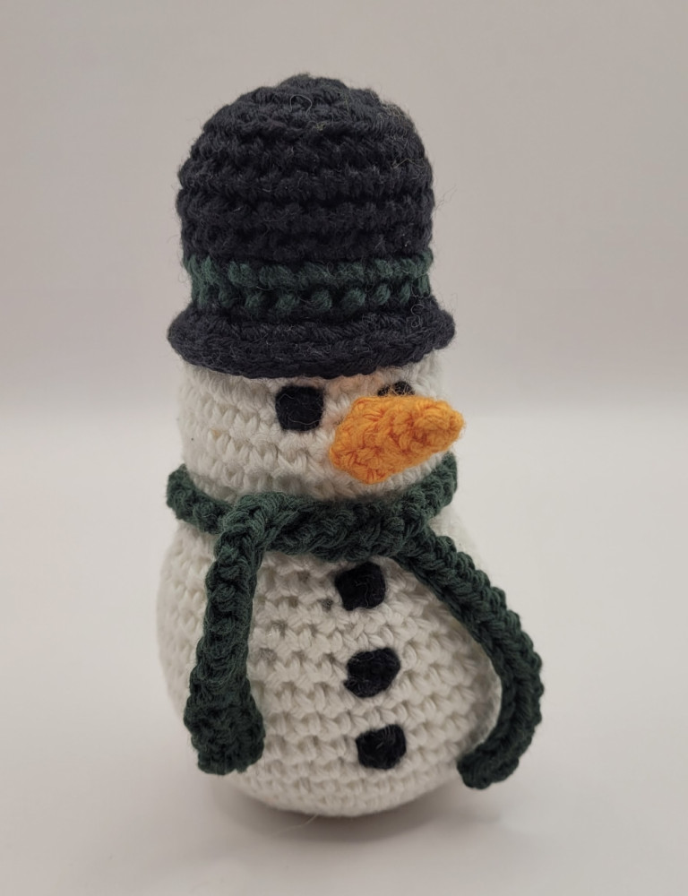 Denne håndhæklede snemand er fyldt med charme og julestemning. Den måler ca. 12 cm i højden og er ideel som pynt i vindueskarmen, på hylden eller som en del af en juledekoration.