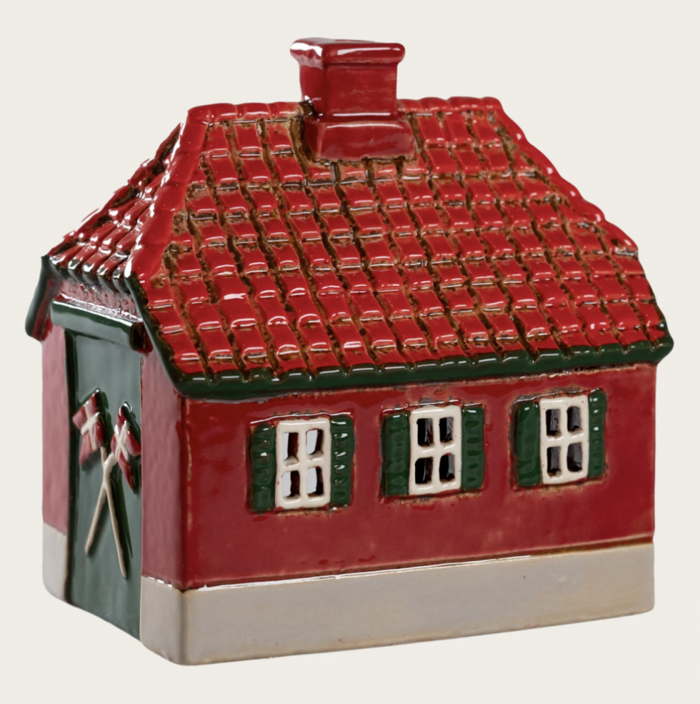 Dette smukke lille hus i dolomit er inspireret af den klassiske danske byggestil med røde vægge, tegltag og grønne skodder. De fine detaljer, som de små dannebrogsflag på siden, giver et charmerende og hjemligt udtryk. Brug huset som en dekorativ figur alene eller sammen med andre huse for at skabe et hyggeligt landskab på reolen, i vindueskarmen eller på julebordet.