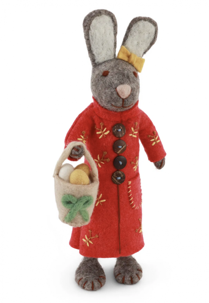 Disse charmerende filtede kaniner er håndlavet i uld med stor sans for detaljer og et varmt, poetisk udtryk. Hver figur har sit eget look – fra kjoler og striktrøjer til små gulerødder, blomster og kurve – hvilket gør dem helt unikke.