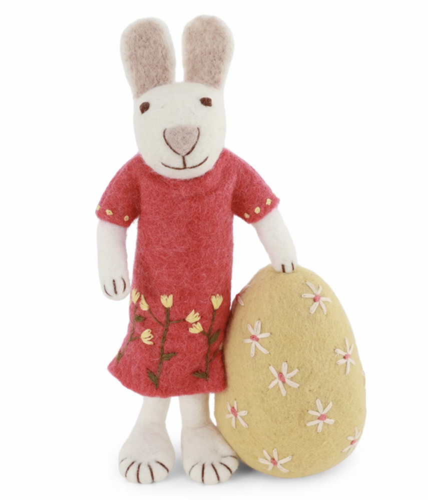 Disse charmerende filtede kaniner er håndlavet i uld med stor sans for detaljer og et varmt, poetisk udtryk. Hver figur har sit eget look – fra kjoler og striktrøjer til små gulerødder, blomster og kurve – hvilket gør dem helt unikke.