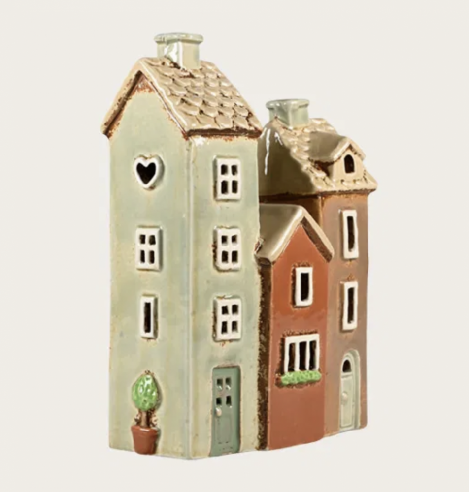 Dette fine keramiklyshus forestiller tre sammenbyggede huse i smukke, afdæmpede farver. Detaljer som vinduer, døre og tagstruktur giver et charmerende, håndlavet udtryk, der passer perfekt ind i den nordiske boligstil. Placer et fyrfadslys eller LED-lys indeni, og se hvordan de små vinduer lyser op og spreder en hyggelig stemning i rummet.