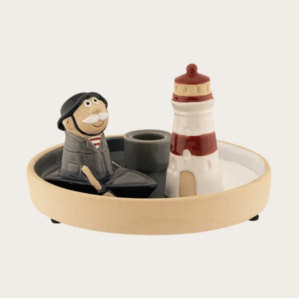 Skab en hyggelig og stemningsfuld fødselsdagstradition med denne fine lystestage i stentøj. Stagen er dekoreret med et maritimt kysttema, hvor en glad fisker sidder i sin båd ved siden af et klassisk rød-hvidt fyrtårn. De håndmalede detaljer og bløde former giver et varmt, nostalgisk udtryk, som passer smukt ind på fødselsdagsbordet eller børneværelset.