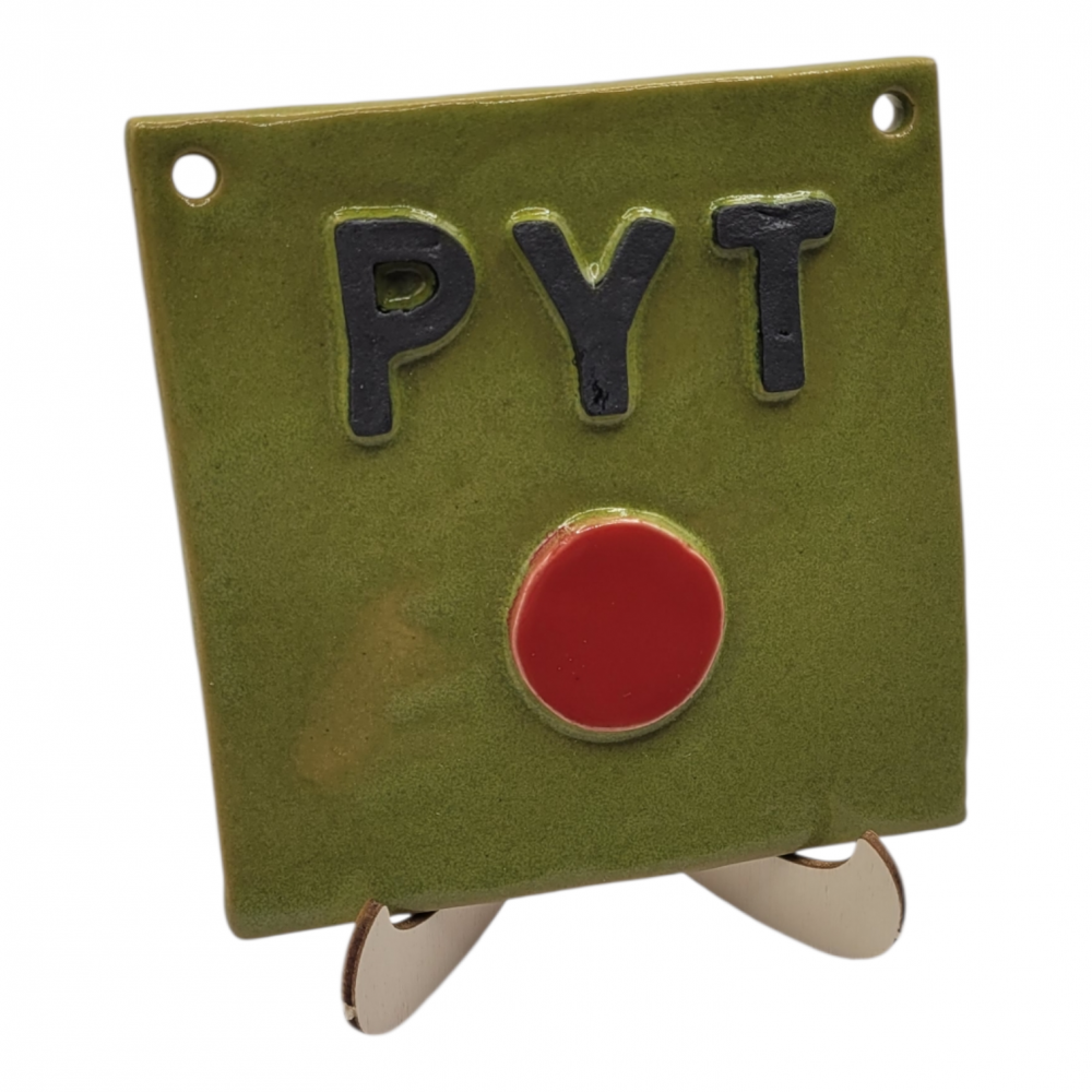 Denne håndlavede keramik PYT-knap er en kærlig påmindelse om at tage livet lidt lettere. Med sin grønne glasur, tydelige sorte bogstaver og den røde midterknap er den både dekorativ og fuld af personlighed.