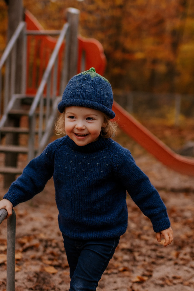 Dette charmerende håndstrikkede sæt, bestående af sweater og hue, er skabt til børn på 3–4 år. Strikket i en luksuriøs blanding af 65 % uld og 35 % alpaca, føles det både varmt, let og silkeblødt mod huden – ideelt til de kølige efterårs- og vinterdage. Den dybe marineblå farve med fine detaljer giver et klassisk, tidløst udtryk, mens den perfekte pasform sikrer bevægelsesfrihed under leg. Et unikt stykke håndværk, der kombinerer kvalitet, komfort og nordisk stil.