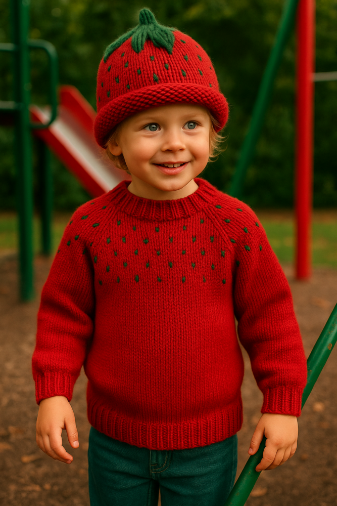 Forkæl den lille med dette unikke, hjemmestrikkede sæt bestående af en jordbær-inspireret sweater og matchende hue.