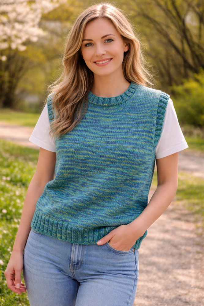 Denne håndstrikkede vest i str. M er fremstillet i klassisk norsk uld – kendt for sin holdbarhed, varme og naturlige kvalitet. Den melerede farvesammensætning i blå og grønne nuancer giver et levende og unikt udtryk, hvor ingen veste er helt ens.
